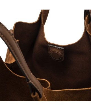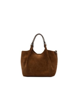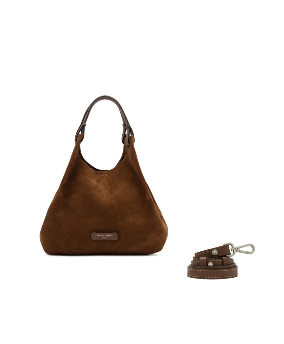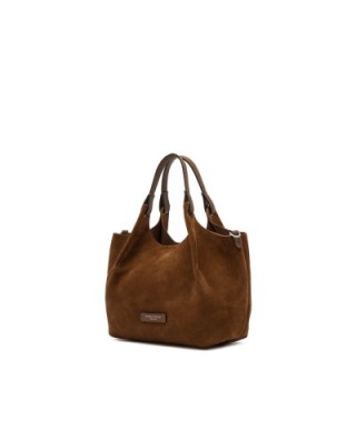 Borsa DUA moka in pelle scamosciata presenta un monoscomparto sfoderato con pochette interna, profili superiori in pelle martellata e doppi manici in tono, tracolla removibile