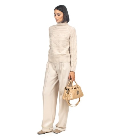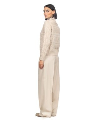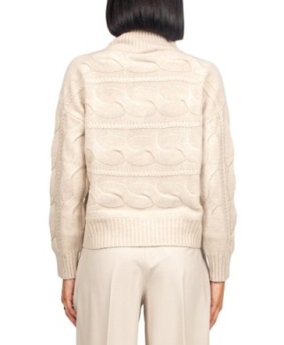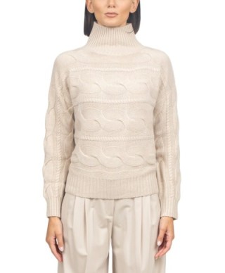 Maglia beige in lana e cachemire a trecce orizizzontali ,collo ato a cratere , volume ampio e linea morbida, manica lunga, polsi e bordo a costine